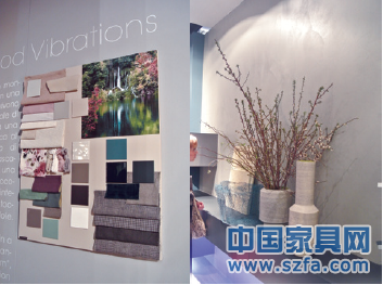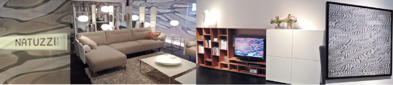 NATUZZI今年聘用專業(yè)的水體攝影師Gianni Basso,讓其用攝影加抽象的手法,表達(dá)水的多姿和靈動(dòng)。整個(gè)展廳的墻面裝飾通體為變形的水波紋,其曲柔的形態(tài)沖淡家具形體的生硬,貌似流淌的靈動(dòng)感賦予家具無(wú)限的生命力。