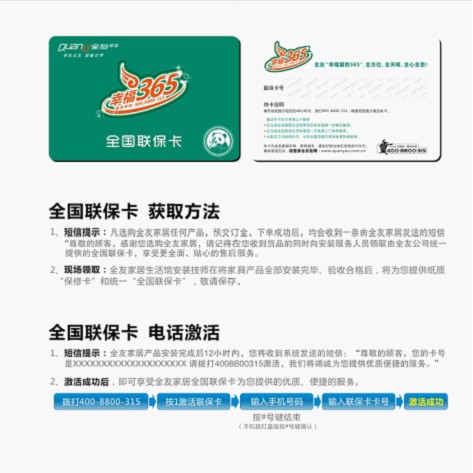 全友家居全國聯(lián)保服務,力求化繁為簡,將所有售后內容集于聯(lián)??ㄖ畠龋M者無需提供發(fā)票、憑證等,憑一卡即可享受全方位的售后服務。此外,憑此卡還可享受到更多增值服務: