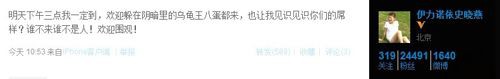 “明天下午三點(diǎn)我一定到,歡迎躲在陰暗里的烏龜王八蛋都來,也讓我見識(shí)見識(shí)你們的屌樣?誰不來誰不是人!歡迎圍觀!”