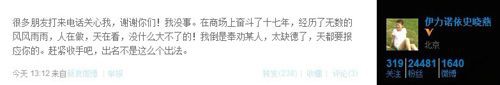 “很多朋友打來電話關(guān)心我,謝謝你們!我沒事。在商場上奮斗了十七年,經(jīng)歷了無數(shù)的風(fēng)風(fēng)雨雨,人在做,天在看,沒什么大不了的!我倒是奉勸某人,太缺德了,天都要報(bào)應(yīng)你的。趕緊收手吧,出名不是這么個(gè)出法。”