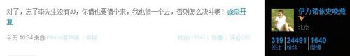 6月8日,伊力諾依家具董事長史曉燕連發(fā)四條微博炮轟李開復(fù)并表示要與其決斗,微博用語極其大膽和憤怒,引眾多網(wǎng)友圍觀。