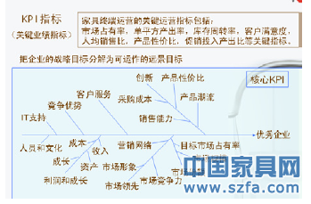 KPI指標(biāo):關(guān)鍵業(yè)績(jī)指標(biāo)。家具終端運(yùn)營(yíng)的關(guān)鍵運(yùn)營(yíng)指標(biāo)包括:市場(chǎng)占有率,單平方產(chǎn)出率,庫(kù)存周轉(zhuǎn)率,客戶滿意度,人均銷售比,產(chǎn)品性價(jià)比,促銷投入產(chǎn)出比等關(guān)鍵指標(biāo)。通過(guò)KPI把企業(yè)的戰(zhàn)略目標(biāo)分解為可運(yùn)作的遠(yuǎn)景目標(biāo)。