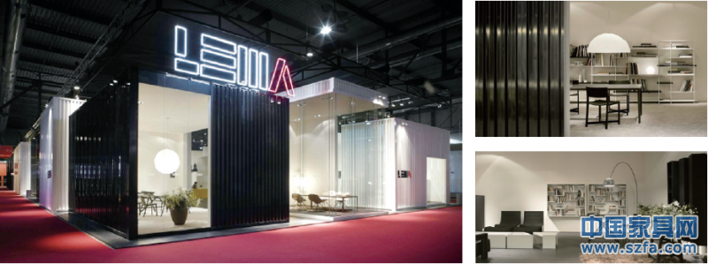 首先來看這個叫LEMA的品牌,它的關鍵詞是模塊化系統(tǒng)。從實景照上,LEMA設計總監(jiān)皮耶羅用黑白兩色的集裝箱,營造了九大空間,隔劃出LEMA產品的”白天系列”和”夜晚系列”。這種做法與東莞展上的CBD做法如出一轍,但是LEMA使用了單層集裝箱,用黑色來作為“夜晚系列”的空間,白色作為“白天系列”的空間。進入到這個展廳后,可以感受到白天家具和夜晚家具不同的氛圍。