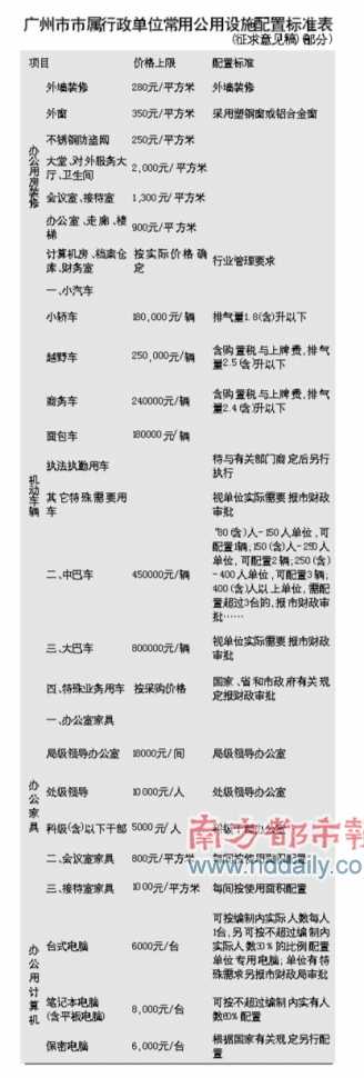 近日,廣州市財政局在其主頁上掛出《廣州市市屬行政單位常用公用設施配置標準(征求意見稿)》廣征民意,財政局稱,這是由于2008版的《配置標準》“有些標準不能適應實際工作要求需要調(diào)整”。
