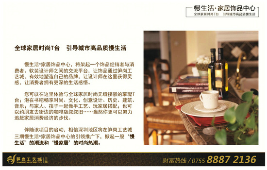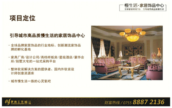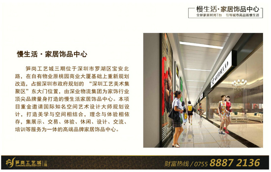 核心提示:筍崗工藝城地處羅湖區(qū)寶安北路與桃園路交匯處,位于政府恢弘規(guī)劃的筍崗家居飾品產(chǎn)業(yè)集聚地核心區(qū)域,自開業(yè)以來獲得了政府、市場和權(quán)威媒體的高度關(guān)注和支持,連續(xù)舉辦了數(shù)屆深圳文博會分會場,并獲得了深圳市重點(diǎn)文化企業(yè)、深圳市文化產(chǎn)業(yè)基地、深圳市文化+旅游型示范園區(qū)等二十余項(xiàng)榮譽(yù)稱號。筍崗工藝城致力于成為國內(nèi)領(lǐng)先、國際化的家居飾品高端專業(yè)市場運(yùn)營商,整體規(guī)劃30萬㎡,將打造成為超大規(guī)模的全球家飾采購中心。