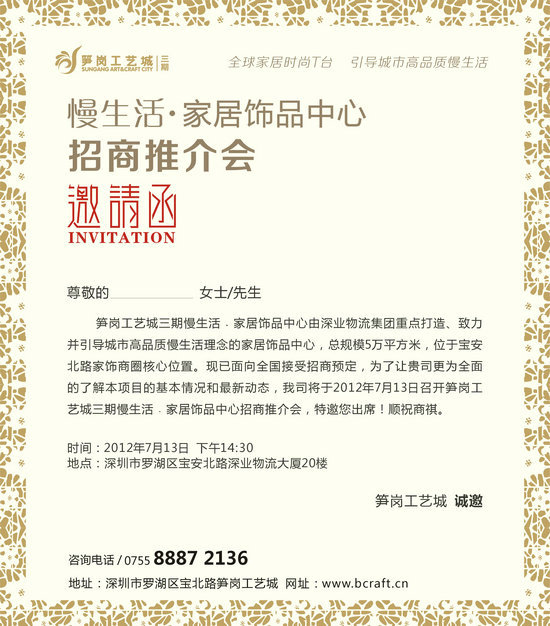筍崗工藝城三期慢生活﹒家居飾品中心由深業(yè)物流集團(tuán)重點(diǎn)打造、致力并引導(dǎo)城市高品質(zhì)慢生活理念的家居飾品中心,總規(guī)模5萬(wàn)平方米,位于寶安北路家飾商圈核心位置?,F(xiàn)已面向全國(guó)接受招商預(yù)定,為了讓貴單位更為全面的了解本項(xiàng)目的基本情況和最新動(dòng)態(tài),我司擬于2012年7月13日召開筍崗工藝城三期慢生活﹒家居飾品中心招商推介會(huì),特邀您在百忙之中出席!順祝商祺。