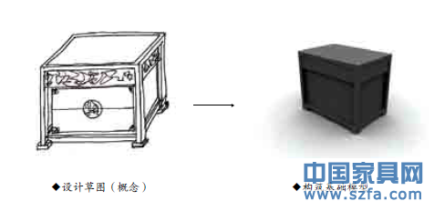 不考慮所有裝飾部件,僅用最基礎(chǔ)的結(jié)構(gòu)件構(gòu)筑產(chǎn)品的骨架,以此骨架作為產(chǎn)品的基礎(chǔ)模型。在此,我們假設(shè)前期的市場(chǎng)調(diào)查、產(chǎn)品概念及企劃、方案構(gòu)思都已完成,依照我們?cè)ǖ姆桨?,開始進(jìn)行擴(kuò)展設(shè)計(jì)。并借用一款中國(guó)傳統(tǒng)漆藝床頭柜的設(shè)計(jì)的案例加以說(shuō)明。