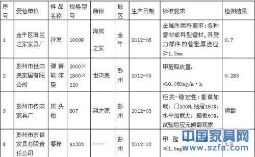 此外,有2批次的軟體家具產(chǎn)品不合格,其中彭州市世杰美家居有限公司的一批次2000×1800×220“世杰美” 彈簧軟床墊(2012-03),檢出甲醛釋放量超標。另有1批次的沙發(fā)金屬件用料要求不合格。