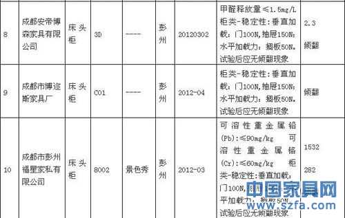 本次抽查中發(fā)現(xiàn),有30批次的木家具產(chǎn)品不合格,其中包括成都安帝博森家具有限公司3D床頭柜、成都紫玉家私有限責任公司666“紫玉” 床頭柜、成都市華之龍家俱有限公司“華之龍”活動柜在內(nèi)的10批次產(chǎn)品甲醛釋放量不合格。另有有25批次產(chǎn)品穩(wěn)定性不合格、3 批次產(chǎn)品抽屜滑道強度不合格、1批次產(chǎn)品可溶性重金屬超標。