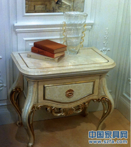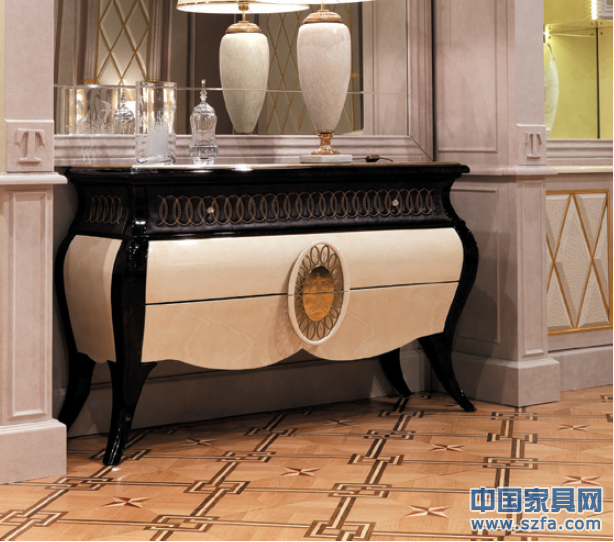 這一系列的產(chǎn)品風(fēng)格源于傳統(tǒng)的洛可可式樣,運(yùn)用C形、S形和渦旋狀曲線紋飾蜿蜒反復(fù),精心設(shè)計(jì)的貝殼狀拉手,鋸齒形莨苕葉雕刻紋飾,并以24K金箔裝飾,盡顯極致奢華、高貴典雅,白色高亮雙色漆的表面處理模糊了傳統(tǒng)與時(shí)尚之間的界限。