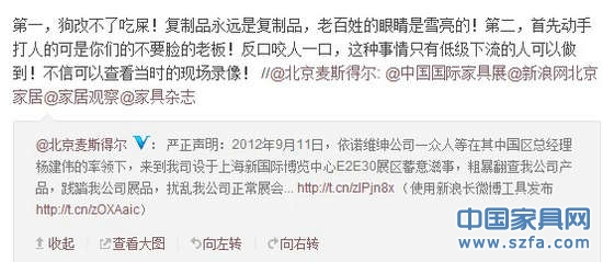 由此,依諾維紳VS麥斯得爾由上海國際家具展現(xiàn)場的“踢館”維權(quán)到展會后的微博“罵戰(zhàn)”升級。