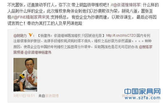 9月15日凌晨,北京麥斯得爾工貿(mào)有限公司《嚴正聲明》,緊接著便有了楊建偉的微博跟進,掀起了2012年初秋的家具行業(yè)最具影響力最受關(guān)注的微博“罵戰(zhàn)”。