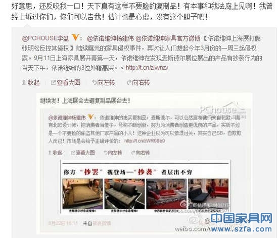 ◆◆@盧亦葦 : 每年都看展,抄襲之風蔓延展會有愈演愈烈的趨勢,從單品抄襲,到系列抄襲,到TM全盤抄襲再吹鑼打鼓,行業(yè)風氣是爛,那就低調(diào)點悶聲大發(fā)財行不行,一定要武大郎穿袍子,抱團上臺唱大戲么?這種自我感覺太良好的品牌就該每年被正規(guī)組織點名!@真情家具TIME @慕慕秋