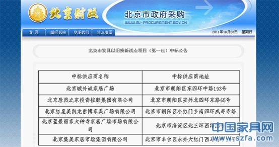 10月15日,中國政府采購網(wǎng)公布了北京市商務(wù)委員會北京市家具以舊換新試點(diǎn)項目中標(biāo)結(jié)果,居然之家成功中標(biāo)項目第一包(項目編號:BJJQ-2012-281-01 ),成為首批以舊換新的家具銷售定點(diǎn)供應(yīng)商。