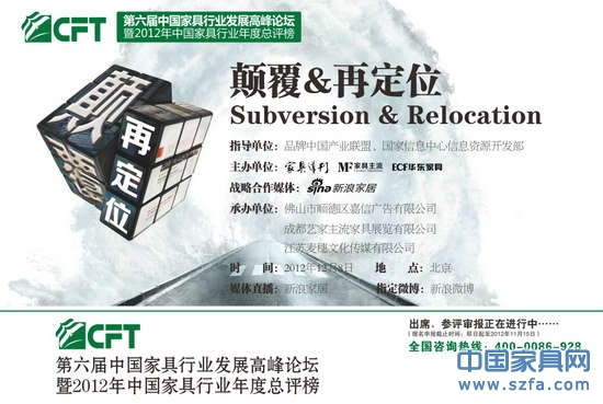 2012年對中國家具行業(yè)而言,是一個特殊的年份,國際環(huán)境風(fēng)云莫測,海外市場趨勢未明,而國內(nèi)又同時面臨著產(chǎn)能過剩,通貨膨脹以及房地產(chǎn)調(diào)控等種種不利形勢。在這個充滿不確定性的時代,如何顛覆傳統(tǒng),重新定位?進(jìn)入二次創(chuàng)業(yè)期的企業(yè),又該以怎樣的身份直面內(nèi)需為本的新時代?以電商為代表的新渠道,會不會開啟流通變革的3.0時代?2012年12月,在首都北京,“顛覆&再定位”中國家具行業(yè)發(fā)展高峰論壇暨第六屆(2012)中國家具行業(yè)年度總評榜盛典上,以艾豐、李光斗、鄧德隆為代表的數(shù)百名意見領(lǐng)袖和實(shí)戰(zhàn)精英,將就以上話題展開討論,探討家具行業(yè)將以怎樣的姿態(tài),應(yīng)對挑戰(zhàn)。
