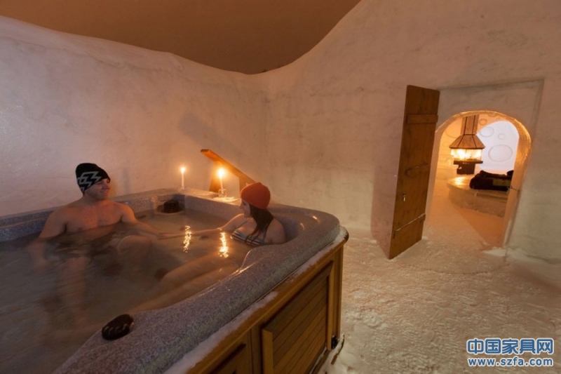 為了吸引更多游客,瑞典、挪威、加拿大等國紛紛推出了冰酒店。冰酒店并不是大號版圓頂冰屋那么簡單,而是建造者的精雕細琢之作,同時還為游客提供世界級的服務(wù),例如自助早餐、桑拿浴、觀賞北極光和體驗狗拉雪橇,讓他們度過一個難忘的假期??笨吮频甑母叨颂追?,備有桑拿浴和熱水浴缸。