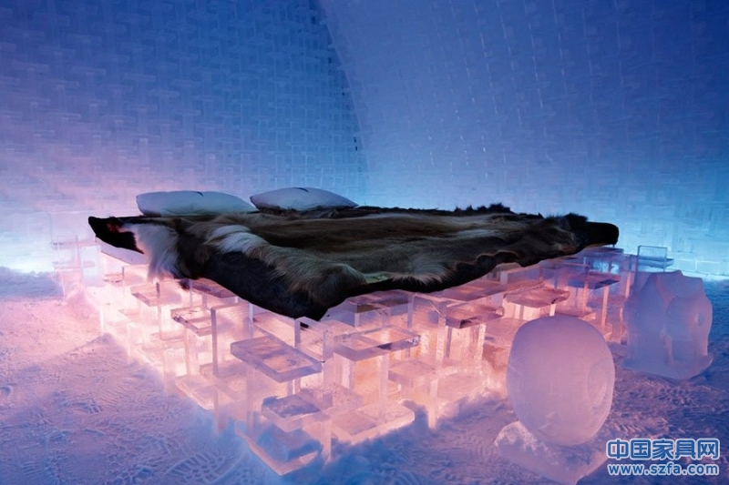 冰酒店的客房各具特色,絕不雷同。照片呈現(xiàn)的客房名為“次元之旅”,雙人床的設(shè)計極富創(chuàng)意。冰酒店為客人們準備了冬衣、手套和鞋子,讓他們度過溫暖的夜晚。早上起來,客人們可以享用自助早餐和桑拿浴。