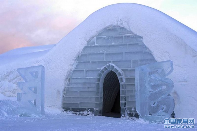 芬蘭雪村酒店的入口。每年的11月末,雪村都會重建,耗費(fèi)大約1000輛卡車雪。