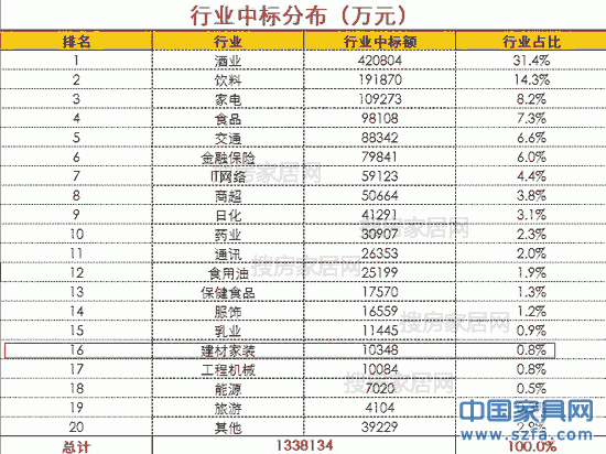 經(jīng)過13個多小時的激烈競標,中央電視臺2013年黃金資源廣告招標昨晚結(jié)束,央視招標預(yù)售總額達158.8134億元,比去年(142億)增長了16.2377億元,增長率為11.39%。2012年,家居建材行業(yè)中,紅星美凱龍、圣象、顧家家居三家同投央視黃金資源的熱潮似乎冷卻了,今年家居建材業(yè)中標占總比僅為0.8%,而且來自紅星美凱龍一家。