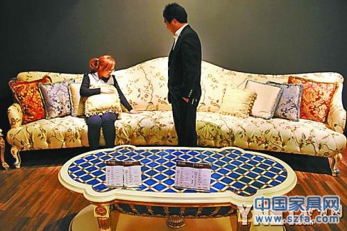 意大利高端品牌代表CA,動(dòng)輒7位數(shù)的價(jià)格,以鑲嵌、貼金箔等手工技藝見長(zhǎng),向來(lái)是高端人士的心頭愛。在超舒適國(guó)際家居CA展區(qū)我們發(fā)現(xiàn),這個(gè)意大利 “貴族”放下了身段,原價(jià)108萬(wàn)的精細(xì)鑲嵌雕花圓桌,降價(jià)36.3%,目前價(jià)簽上的標(biāo)價(jià)是688000元。此外,其多款產(chǎn)品整體降價(jià)幅度大約在30% (右圖:價(jià)簽已改,消費(fèi)者正在比較價(jià)格)。故弄玄虛還是真降價(jià)?對(duì)此,銷售人員拿出這款圓桌的銷售記錄,以往的銷售記錄及價(jià)簽上的確顯示“銷售價(jià) 1080000元”。