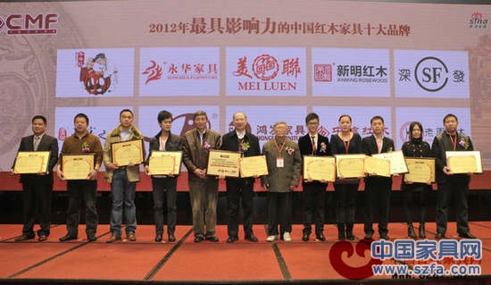 2012年最具影響力的中國(guó)紅木家具十大品牌企業(yè)代表上臺(tái)領(lǐng)獎(jiǎng)并合影留念