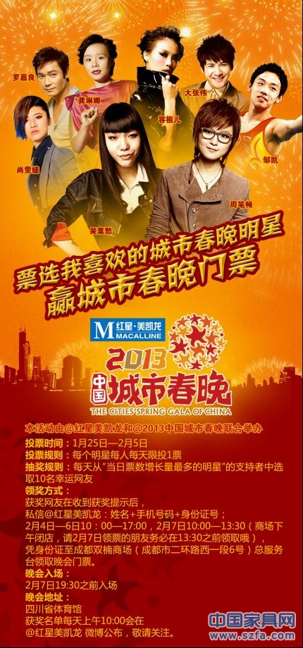 核心提示:曾幾何時,當(dāng)港臺明星開始登上春晚舞臺,明星開始成為春晚節(jié)目單上必不可少的一道風(fēng)景,娛樂性也隨之成為了評判春晚質(zhì)量的一把標(biāo)尺。伴隨著春節(jié)佳節(jié)的臨近,由紅星美凱龍全程冠名的“幸福城市?美麗中國”2013中國城市春節(jié)聯(lián)歡晚會,將于2013年2月7日20時于四川省體育館隆重開場,秉承“以家為本”的品牌理念,紅星美凱龍希望能在新春佳節(jié)即將到來之際,為中國萬千家庭獻(xiàn)上一段與家人團聚的美好時光。