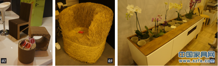 環(huán)保是是國外家具設計的一大主要特征??梢哉f,國外的家具設計是在環(huán)保這一大環(huán)境下進行的。一方面,國外的法律制度制定了環(huán)保、低碳的標準,國外公民要想不遵守環(huán)保所花費的代價比較大。另一方面。國外公民有著強烈的環(huán)保意識,這從他們的衣、食、住、行中就可以看出。環(huán)保的理念反映到家具設計與制造的全過程之中。如圖1、2示的家具運用了比較環(huán)保的板材;圖3所示的椅子直接用麥子的秸稈捆扎而成;圖4則將花盆直接嵌入到邊柜中。