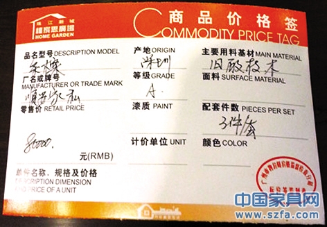 記者日前走訪了城中多個主流賣場,每個賣場少則有四五家紅木家具店,多則有八九家,但記者看到,只有少數(shù)商家為產(chǎn)品準備了“一書一卡一證”,絕大多數(shù)商家仍然只有一張價格標簽,只是標簽上的內(nèi)容有了改進,如某大賣場的一家紅木家具店,在幾個月前的標簽還是籠統(tǒng)標注“紫檀”、“花梨”,現(xiàn)在則清晰地標注“俗稱”、“中文學(xué)名”和“拉丁文名”。