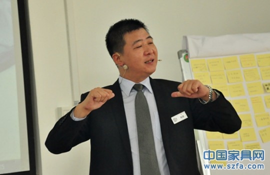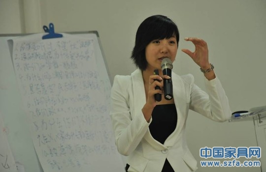 高老師快樂授課,圖為在講解家居顧問的八個(gè)流程訓(xùn)練:迎客、接觸、產(chǎn)品介紹、引導(dǎo)顧客感受產(chǎn)品、開顧客的心門、處理反對(duì)意見、成交動(dòng)作、留客。