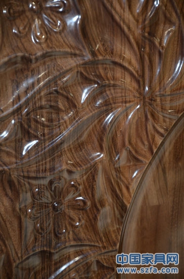 作為首次亮相深圳展的金富信,產(chǎn)品巧用一個款式、兩種木材的方式參展,經(jīng)銷商可以根據(jù)市場行情自由地在亞花梨和烏金木兩種木材中選擇,以免在陷入烏金木大戰(zhàn)的泥沼中可以有所退路。烏金木的紋理大氣而又不失靈秀得到了眾多廠家的厚愛,可是產(chǎn)品過硬的特質(zhì)和后期容易開裂的特點又令人難以駕馭。但這對于金富信來說,卻不存在這樣的問題。老總介紹,金富信前后一共花了四年的時間對木材的特性進(jìn)行充分的研究,其面板創(chuàng)新采用了三層三毫米的烏金木板材縱橫交錯的方式以解決開裂問題,像織布一樣用木材的紋理橫豎交織以增強韌性。此外,在烘干上也特別下功夫。所用木材經(jīng)過高溫噴蒸和二次烘干徹底解決了產(chǎn)品開裂變形等質(zhì)量問題。金富信總經(jīng)理王亮介紹,一般南方的木材烘干處理達(dá)到14%的含水率即可,但是北方一般在8%左右,但后面的烘干周期很關(guān)鍵,水分越少越難烘干,所以金富信對于木材的烘干一直嚴(yán)格把控,不會少于60天。