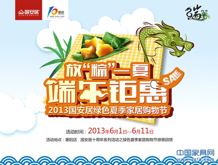 6月1日-6月11日,國安居五店同時舉行端午鉅惠,放“粽”一夏2013年度國安居綠色夏季家居購物節(jié)。活動期間凡在國安居各分店購物下定滿1000元就可獲得兌獎券一張,可到國安居各店一樓服務(wù)臺兌換相應(yīng)的禮品。國安居工作人員解讀到:活動期間集夠1張兌獎券,就可兌換到價值68元的粽子禮盒一份;如果集夠3張,可兌換價值168元的粽子禮盒一份;集夠6張可兌換價值388元的骨瓷餐具套裝一份,集夠10張可兌換到床上四件套裝一份。除此之外,國安居五店在活動期間內(nèi)會有千余款半價起產(chǎn)品供廣大業(yè)主前來搶購。如果您有這方便的需求,不妨在這個端午節(jié)期間去國安居各店逛逛!