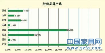 所經(jīng)營品牌產(chǎn)地情況,其中來自廣東的品牌占比39.78%,浙江本地29.03%,第三位的是江蘇,12.90%。此種情形不只是浙江,在其他地方的賣場也會(huì)出現(xiàn)經(jīng)銷商所代理的品牌廣東占比居多。廣東,素有“中國家具看廣東”,另外由于廣東與國際接軌,潮流更新快,也不乏一些內(nèi)地的企業(yè)注冊廣東的品牌。近幾年,浙江的家具產(chǎn)業(yè)也不斷崛起,浙江土地上本土品牌代理多也是很自然的事情。