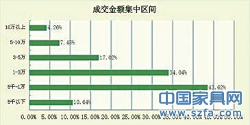 對于家具單筆成交的金額主要集中在兩個(gè)區(qū)段,5千-1萬、1-3萬,分別占比43.62%和34.04%。家具對于中國市民來說目前還算不上是一個(gè)快速消費(fèi)品,5千到3萬消費(fèi)比例為77.66%,最少的區(qū)段的是10萬以上,占比4.26%,畢竟對于家具這種高端需求還是比較小。