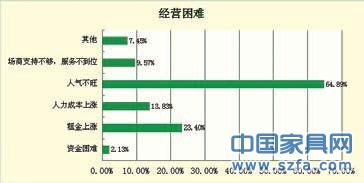 問卷中關(guān)于經(jīng)營中的一些困難, 賣場人氣不旺遙遙領(lǐng)先成為NO.1,達(dá)到64.89%。其次是租金上漲,23.4%的比例,人力成本上漲以及廠商支持不夠分別為13.83%和9.57%,資金困難2.13%,由此可見大多經(jīng)銷商經(jīng)營過程中都不差錢。不過人力成本上漲是整個(gè)社會(huì)的現(xiàn)象并不是家具行業(yè)的特例。賣場人流量是影響銷售的關(guān)鍵因素,但是隨著各種活動(dòng)的此起彼伏,也并非所有的活動(dòng)都奏效。