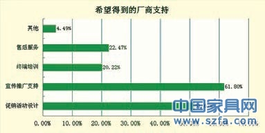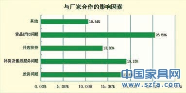 在影響與廠家合作的因素中,貨品折扣是經(jīng)銷商最關(guān)心的,這與消費(fèi)者進(jìn)店購買家具是一個(gè)理,消費(fèi)者希望拿到性價(jià)比高的產(chǎn)品,同樣經(jīng)銷商也希望從廠家拿到最低折扣的產(chǎn)品。在補(bǔ)貨及售后服務(wù)以及發(fā)貨問題上分別有19.15%和18.09%的經(jīng)銷商選擇,也不乏一些經(jīng)銷商抱怨廠家的發(fā)貨不及時(shí)以及產(chǎn)品更新周期長。但是在調(diào)研過程中,大部分經(jīng)銷商都表示與廠家之間的大部分時(shí)候合作的很愉快。但是也有一些廠家在經(jīng)銷商加盟拿貨后采取放任自流式的態(tài)度。