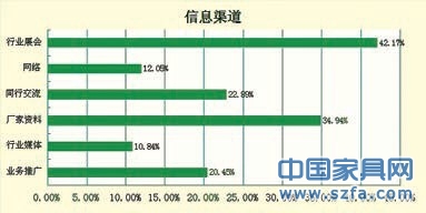 關(guān)于獲取產(chǎn)品的信息渠道,行業(yè)展會(huì)占比42.17%,其次是廠家資料,第三是同行交流。而業(yè)務(wù)推廣、網(wǎng)絡(luò)以及行業(yè)媒體則分別為20.45%、12.06%以及10.84%。從中可知,隨著家具行業(yè)的競爭越來越激烈,以前生產(chǎn)出來就自會(huì)有經(jīng)銷商找上門來代理的時(shí)代漸漸過去了,家具廠家的業(yè)務(wù)推廣也漸漸重要起來。
