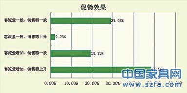 隨著產(chǎn)品的可選擇性越來越多以及各種假日多經(jīng)濟(jì)的刺激,各行各業(yè)的活動(dòng)頻出且五花八門,當(dāng)然家具行業(yè)也不能落后。在調(diào)研中,一經(jīng)銷商告訴筆者,現(xiàn)在即使你不做活動(dòng),消費(fèi)者也等著你做活動(dòng)。對于活動(dòng)的效果,其中48.39%的經(jīng)銷商選擇活動(dòng)時(shí)伴隨著客流量的增加,銷售額也會(huì)上升。而客流量一般,銷售一般,也有29.03%的比例。此種情況原因有二:一,商場對活動(dòng)的宣傳力度或者消費(fèi)者可接觸的便利度不夠;二,消費(fèi)者對各種活動(dòng)已經(jīng)“不感冒”,對“羊毛出在羊身上”的營銷方式已經(jīng)有免疫能力。