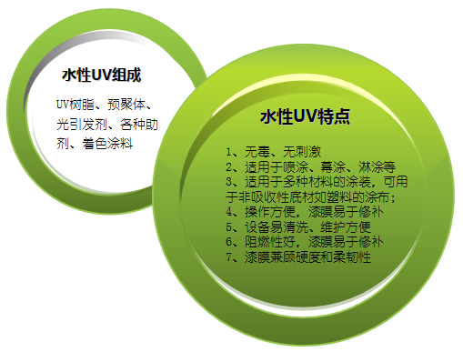 UV漆和水性漆都是環(huán)保漆的兩個(gè)發(fā)展方向,UV光固化體系以其固化速度快、生產(chǎn)效率高、涂層物化性能好等優(yōu)勢(shì),在近多年來得到了高速發(fā)展。但是,傳統(tǒng)的油性UV在應(yīng)用時(shí)存在著局限性:首先從環(huán)保角度,油性UV揮發(fā)性強(qiáng),對(duì)人的眼睛和粘膜有較強(qiáng)的刺激作用,皮膚接觸也易導(dǎo)致過敏。同時(shí)許多油性UV反應(yīng)性稀釋劑在紫外光固化過程中難以反應(yīng)完全,直接影響著固化后產(chǎn)品的衛(wèi)生安全性能。其次從涂裝工藝上看,在噴涂方面一直是油性UV的短板,不管是安全性,環(huán)保等各種因素,傳統(tǒng)的油性UV是很難適用于噴涂的。