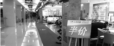 昨天上午,陰雨綿綿。雖然沒有像傳言那樣停電停空調(diào),歐亞達濱江店仍然照常經(jīng)營,但人氣跌到了谷底。記者視線范圍內(nèi)營業(yè)員比顧客要多得多,差不多三分之一的店面處于關(guān)門或半歇業(yè)的狀態(tài),堅持營業(yè)的也都在門口豎起牌子——雙休特惠,或干脆“半價”。