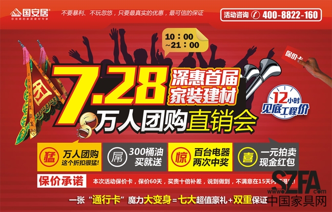國(guó)安居家居建材連鎖商場(chǎng)副總經(jīng)理鄧劍峰說(shuō):國(guó)安居發(fā)展至今十年一直堅(jiān)持“以人為本,誠(chéng)信經(jīng)營(yíng),”的理念,為再次體現(xiàn)和強(qiáng)調(diào)我們這一理念,本次活動(dòng)當(dāng)天惠陽(yáng)國(guó)安居一樓大廳將特別設(shè)置價(jià)格服務(wù)舉報(bào)臺(tái),對(duì)于此次活動(dòng)我們鄭重承諾:保價(jià)60天,買(mǎi)貴十倍補(bǔ)差,15天內(nèi)不滿意可退訂!毋庸置疑,惠陽(yáng)國(guó)安居7月28日萬(wàn)人團(tuán)購(gòu)會(huì)上近百款千元品牌建材1元起拍,百余款正品建材產(chǎn)品2折起搶購(gòu),讓所有業(yè)主放心購(gòu)買(mǎi),將省錢(qián)進(jìn)行到底,另外享受強(qiáng)有力的售后服務(wù)保障。國(guó)安居航天國(guó)企,值得信賴(lài)的家居建材專(zhuān)家。