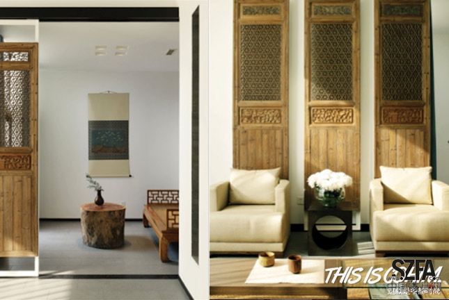 是對中國文化理解上的當代再設(shè)計,在門、墻、色彩等重要建筑要素上體現(xiàn)傳統(tǒng)的中式風采,但是也將鋼、玻璃、大開窗等現(xiàn)代材質(zhì)大加發(fā)揮。重視文化意蘊;配飾用文人字畫、古玩、雕刻、盆景等藝術(shù)品加以點綴。