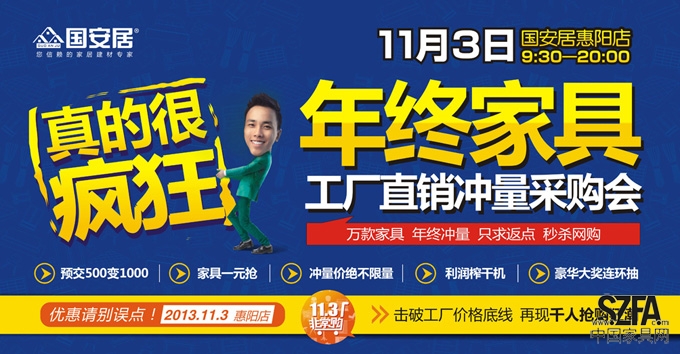 繼中秋十一雙節(jié)鉅惠活動狂攬千余萬之后,11月3日國安居惠陽店家具區(qū)“家具年終工廠直銷沖量采購會”將卷土再來。屆時將展示國內(nèi)外各風格、各品類名品家具。更有定金翻倍、豪華大獎等優(yōu)惠活動等您參與,讓您見證并親歷一場由國安居惠城店打造的家具超級盛宴。