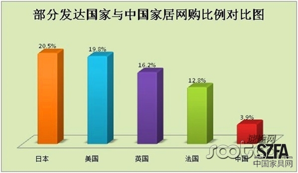 從線上市場(chǎng)整體來看,增長(zhǎng)態(tài)勢(shì)明顯,主要原因在于線下家居企業(yè)以及天貓這樣的網(wǎng)購(gòu)平臺(tái)都在積極推動(dòng)家居觸電的行程.規(guī)模占比較小的主要原因在于線下家居賣場(chǎng)的聯(lián)合抵觸和購(gòu)買環(huán)節(jié)的體驗(yàn)度不夠等原因。從長(zhǎng)遠(yuǎn)趨勢(shì)來看,家居電商的地位越來越重要其交易規(guī)模也將會(huì)越來越大。我國(guó)目前家居行業(yè)的占比比較低,那么其他國(guó)家家居的網(wǎng)購(gòu)比例又是怎么樣的呢?