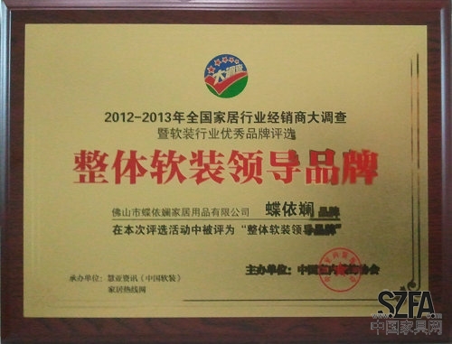 蝶依斕榮獲2013年整體軟裝領(lǐng)導(dǎo)品牌稱號