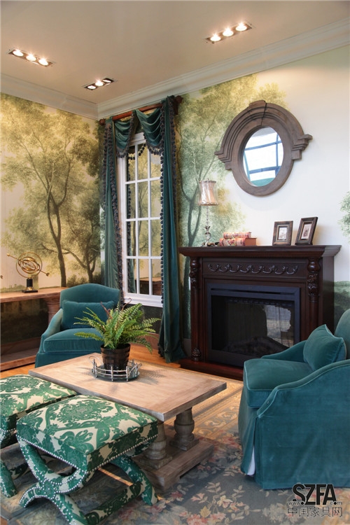 空間整體的色彩以灰橄欖綠、做舊金為主色調(diào),加上主色為亞麻原木色的家具沙發(fā),并描上暗金色點綴其中,再配以依曼琪獨一無二的懷舊風景強制,充分散發(fā)出整體空間的高貴與典雅、溫馨與舒適的自然美感。在面料選擇方面,多采用絨、麻、棉等材質(zhì),砂巖人體雕塑與精致飾品的結(jié)合更豐富了整體空間的構(gòu)成,從而營造出人與自然的和諧之美。