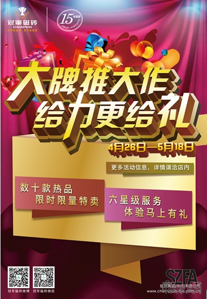 大牌推大作,給力更給禮。冠軍磁磚,給您超值優(yōu)惠、重重驚喜。這個五一,快來與冠軍磁磚來一個激情約會。冠軍將繼續(xù)以世界標(biāo)準的品質(zhì)和服務(wù),為您呈上偉大的選擇。