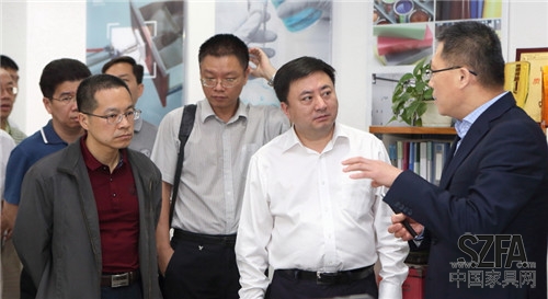 坪山新區(qū)領(lǐng)導(dǎo)劉勝副主任(左)、吳德林主任(中)在侯克鵬會(huì)長(右)陪同下考察深家協(xié)家具研發(fā)部