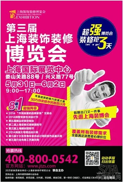核心提示:2014第三屆上海裝飾裝修博覽會即將于5月31日至6月2日端午期間在上海國際展覽中心(婁山關路88號/興義路77號)隆重開幕啦!