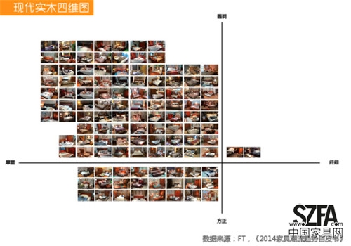 本屆展會(huì)實(shí)木產(chǎn)品的造型多數(shù)集中在圓潤(rùn)-厚重區(qū)間內(nèi),整體上表現(xiàn)出高度同質(zhì)化趨勢(shì)。未來,單就家具造型本身而言,可以從兩個(gè)方向突破產(chǎn)品同質(zhì)化:1、90%的同質(zhì)化+10%的差異化,整體表現(xiàn)出同質(zhì)化,但是細(xì)節(jié)上尋求差異化;2、產(chǎn)品造型向其它維度延伸,這里要注意的是,人群的變量會(huì)因此改變,其它變量也要跟著改變。