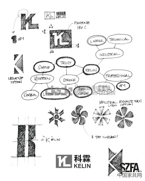 在創(chuàng)意過程中設計師使用了聯(lián)想圖來構思LOGO,最終采用1和字母KL相結合來凸顯品牌的領導者地位。